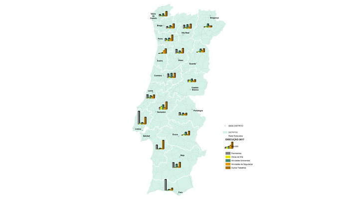 O mapa abaixo apresenta a execução, até junho, das principais atividades em cada distrito, destacando-se os trabalhos em Pavimentos para os distritos de Lisboa e Faro, sendo que as atividades ambientais têm maior destaque nos distritos de Coimbra e Santarém.