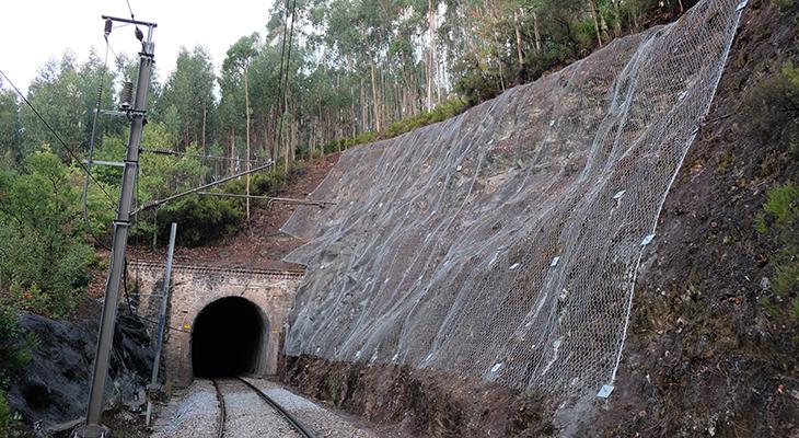 Nos túneis do Azeval e Espinho foram desenvolvidas ações de beneficiação de drenagem e de estabilização dos emboquilhamentos com recurso a rede de proteção.