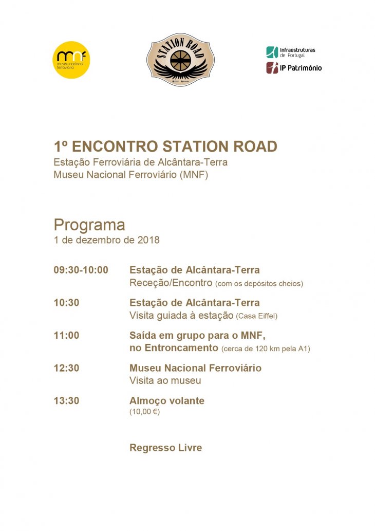 No ponto de encontro, na sede da IPP em Alcântara-Terra, será feita uma breve apresentação da estação aos participantes que, de seguida, se deslocam ao Entroncamento, onde se realizará uma visita guiada ao Museu Nacional Ferroviário, seguida de um almoço volante (€10).