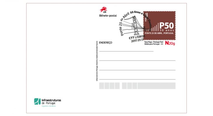 No dia 17 de janeiro a Infraestruturas de Portugal acolheu a cerimónia comemorativa da emissão, pelos CTT, do Inteiro Postal e do Carimbo Ponte 25 de Abril, 50 Anos a Ligar Destinos, uma das iniciativas presentes no programa das comemorações dos 50 anos da Ponte 25 de Abril, que completou meio século de vida no dia 6 de agosto de 2016. A sessão contou com a presença e intervenção do Presidente e CEO dos CTT, Francisco de Lacerda, do Presidente da Infraestruturas de Portugal, António Laranjo, e do Diretor de Filatelia dos CTT, Raul Moreira.