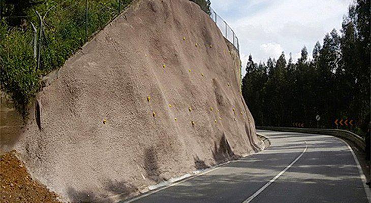 Preconizou-se ainda, para os taludes de caráter mais terroso, um revestimento em betão projetado e pregagens autoperfurantes sistemáticas, acompanhadas de drenagem superficial e interna do talude. O revestimento destes taludes foi efetuado mediante a aplicação de duas camadas de betão projetado, com espessura de 5 cm cada, incorporando entre elas uma rede de malhasol eletrosoldada. A camada exterior foi pigmentada e texturada de forma a reduzir, tanto quanto possível, o impacte ambiental provocado.