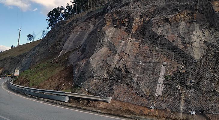 Nas zonas superiores do talude, onde existem depósitos de vertente, aplicou-se uma geomalha volumétrica, por baixo da rede metálica, para controlar a sua erosão. Colocou-se ainda pedra argamassada nas zonas do talude que se encontravam em consola, próximo da base.
