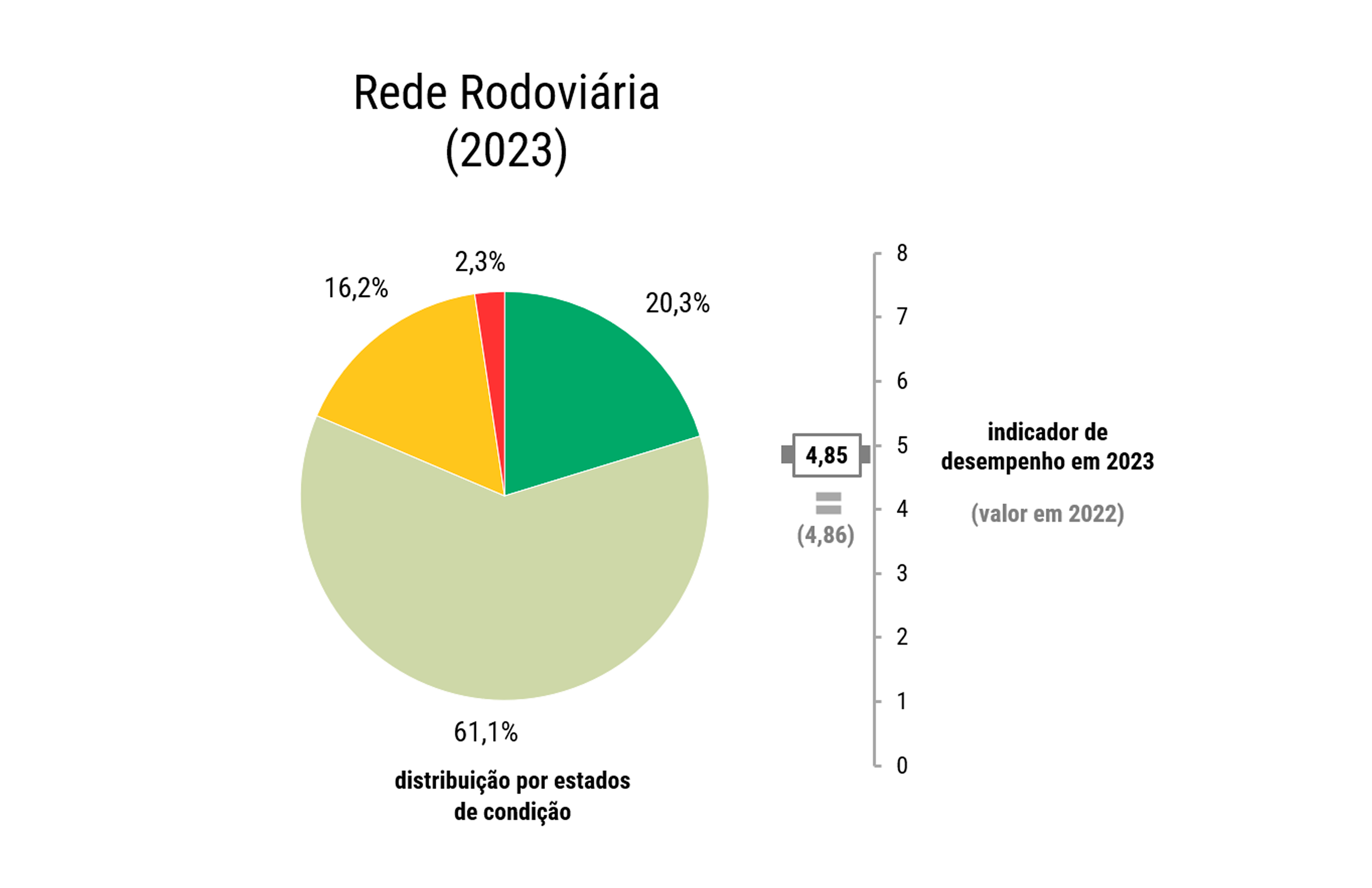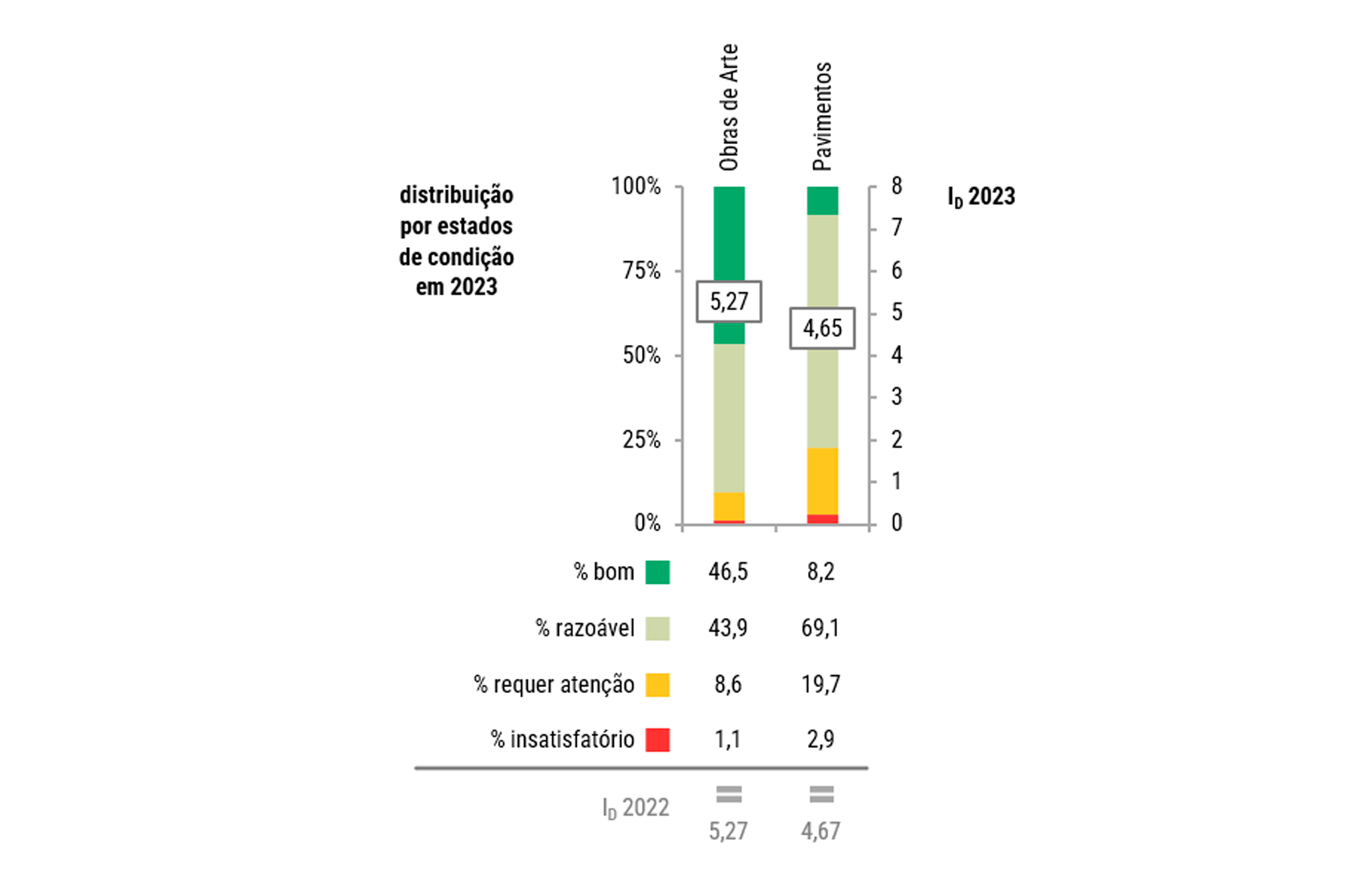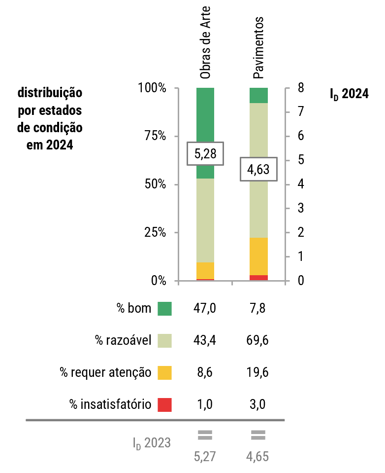 Para os grupos de ativos considerados, regista-se uma ligeira melhoria do indicador nas obras de arte (5,27 em 2023 e 5,28 em 2024) e uma ligeira descida nos pavimentos (de 4,65 em 2023 para 4,63 em 2024). Em ambos os casos, é de referir a elevada percentagem de ativos no estado Bom ou Razoável (na ordem de 90% e 77%, respetivamente).