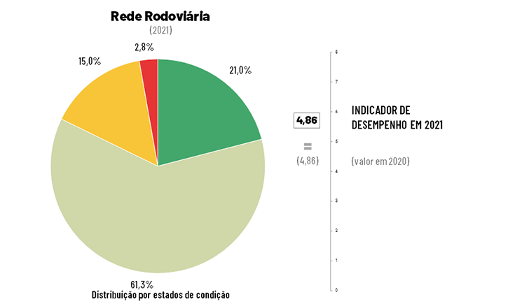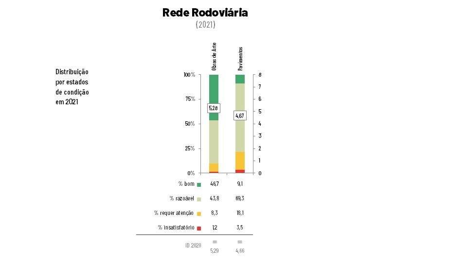 A apresentação de valores representativos da Rede Rodoviária Nacional corresponde à média ponderada (em função dos custos de manutenção e renovação) dos respetivos indicadores de cada grupo de ativos.