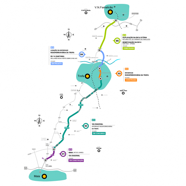O empreendimento da EN14 liga os concelhos de Vila Nova de Famalicão, Trofa e Maia, através da beneficiação e requalificação da atual EN14 e da nova Variante.