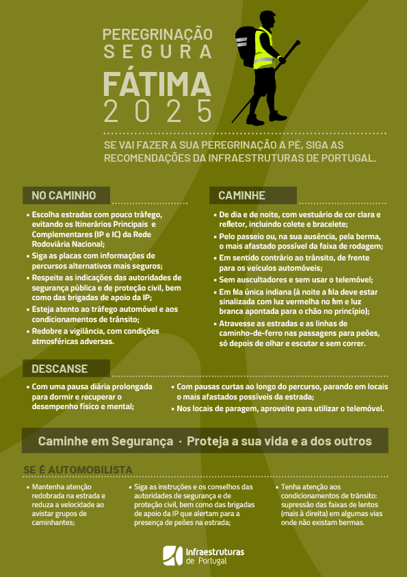 A Infraestruturas de Portugal promove, entre os dias 25 de abril e 13 de maio, a campanha "Peregrinação Segura - Fátima 2025", com ações de sensibilização e de apoio aos peregrinos que se deslocam para o Santuário de Fátima.