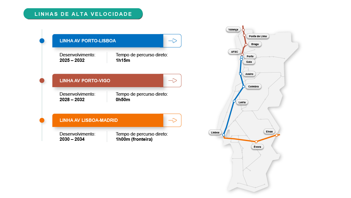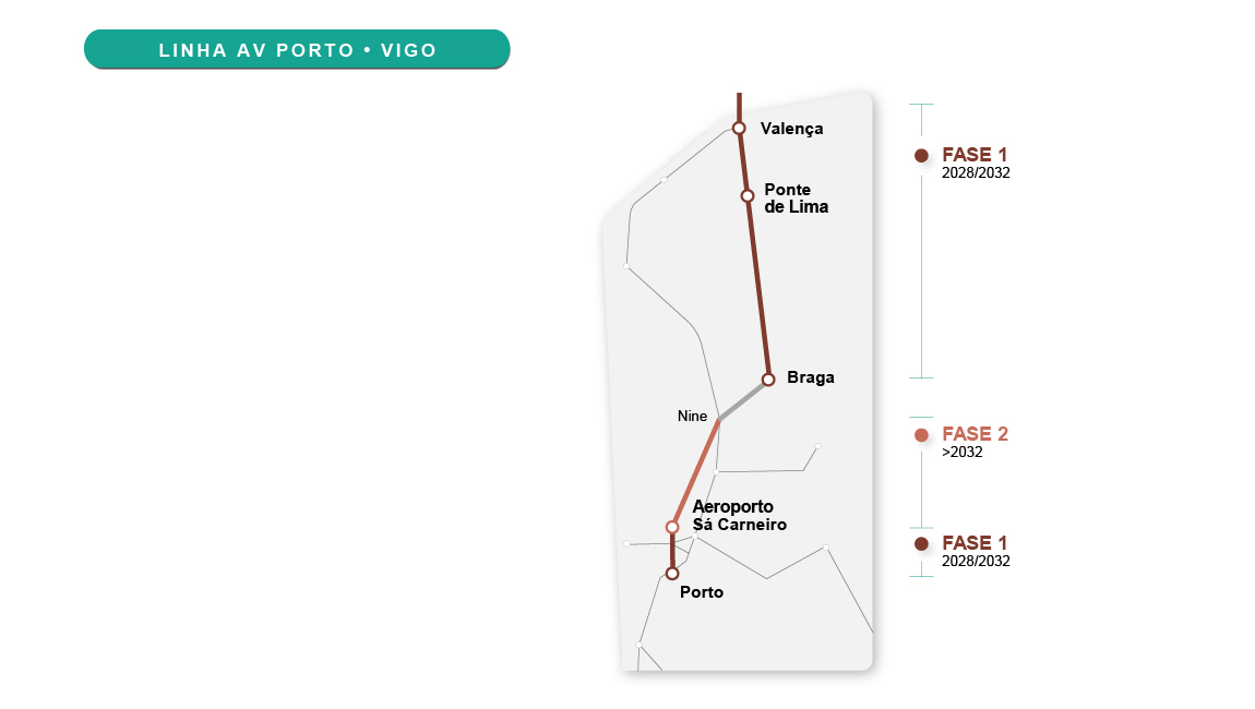 Estão em fase de conclusão os estudos prévios e de impacte ambiental das Fases 1 e 2 da LAV Porto – Vigo, visando a sua submissão a Avaliação de Impacte Ambiental, pela Agência Portuguesa do Ambiente, no 4.º trimestre de 2025. Ao longo desta nova linha estão previstas estações no Aeroporto Francisco Sá Carneiro (AFSC), Braga, Ponte de Lima e Valença. Estão, também, a decorrer os estudos para a ligação transfronteiriça Valença-Tuy, em coordenação com o Governo espanhol, no âmbito do Agrupamento Europeu de Interesse Económico – Alta Velocidade Espanha – Portugal (A.E.I.E. AVEP). A LAV Porto – Vigo está incluída no Corredor Atlântico da Rede Transeuropeia de Transportes e conta com financiamento europeu para os estudos em curso. O lançamento dos respetivos concursos com vista à concessão dos troços da Fase 1 encontra-se previsto para o segundo semestre de 2026, estando a sua construção prevista ocorrer entre 2028 e 2032.