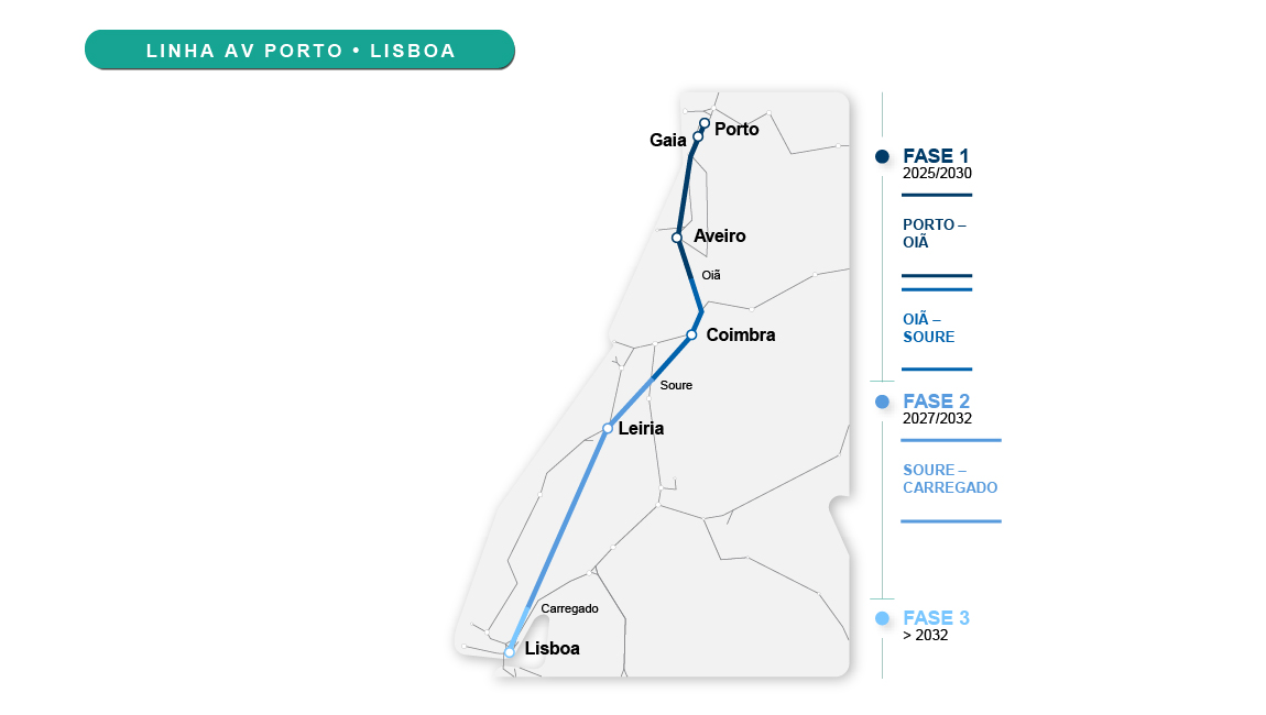 Na sequência da extinção do procedimento concursal lançado em julho de 2024, em virtude de não terem sido recebidas propostas válidas, foi aprovado, em 3 de junho de 2025, através do Despacho publicado no Diário da República, 2.ª série, n.º 109/2025, de 6 de junho, o relançamento do concurso relativo à Concessão do troço da LAV Porto – Lisboa entre Oiã e Soure, o qual também integra a Fase 1 do projeto. Aguarda-se a aprovação da correspondente despesa, o que deverá ocorrer a muito breve trecho. O contrato a celebrar contempla a adaptação da estação de Coimbra B à alta velocidade e aproximadamente 61 km de linha de alta velocidade, com ligações à Linha do Norte nas proximidades de Oiã, Adémia e Taveiro, assim como a quadruplicação da Linha do Norte no troço Taveiro – Coimbra B. A construção encontra-se prevista entre 2027 e 2032.