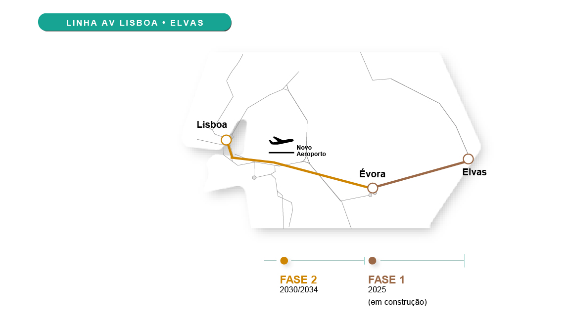 Na Resolução do Conselho de Ministros n.º 68/2024, de 27 de maio, o Governo, reconhecendo a importância estratégica da ligação ferroviária de alta velocidade entre as duas capitais ibéricas, mandatou a IP a antecipar os estudos necessários para garantir a concretização da ligação entre Lisboa e Madrid em 2034, com um objetivo de tempo de percurso entre as duas cidades na ordem das 3 horas. A Fase 1 deste projeto, correspondente à ligação entre Évora e Elvas, que deverá ficar concluída em 2025. Os estudos prévios e estudos de impacte ambiental correspondentes ao Troço Lisboa - Évora da sua Fase 2 encontram-se em curso, com previsão de início da avaliação de impacte ambiental no primeiro semestre de 2026. Encontram-se previstas novas travessias rodoferroviárias do Tejo, a materializar no corredor Chelas – Barreiro, a ligação ao novo Aeroporto Luís de Camões, e novas estações em Évora e Caia, para servir a alta velocidade. Encontram-se em preparação os estudos para a ligação transfronteiriça Elvas-Caia, em coordenação com o Governo espanhol, no âmbito do A.E.I.E. - AVEP. O lançamento do(s) concurso(s) com vista à concessão do(s) troço(s) da Fase 2 da LAV Lisboa-Madrid encontra-se previsto para o início de 2028, estando a construção prevista ocorrer entre 2030 e 2034.